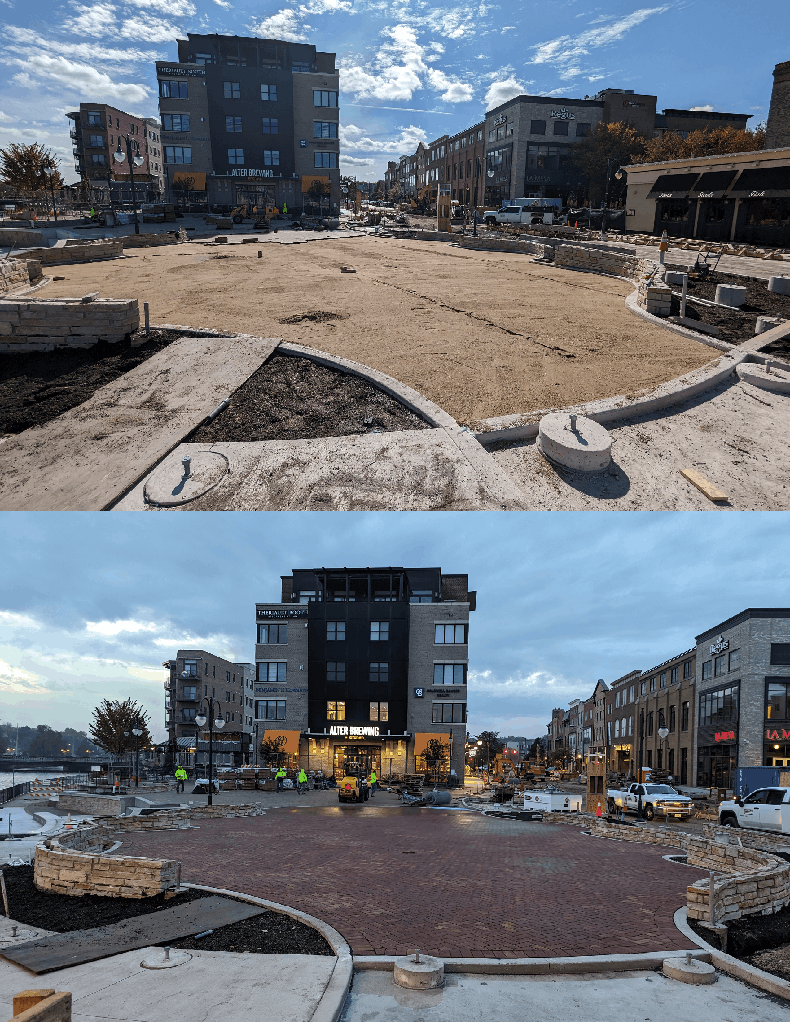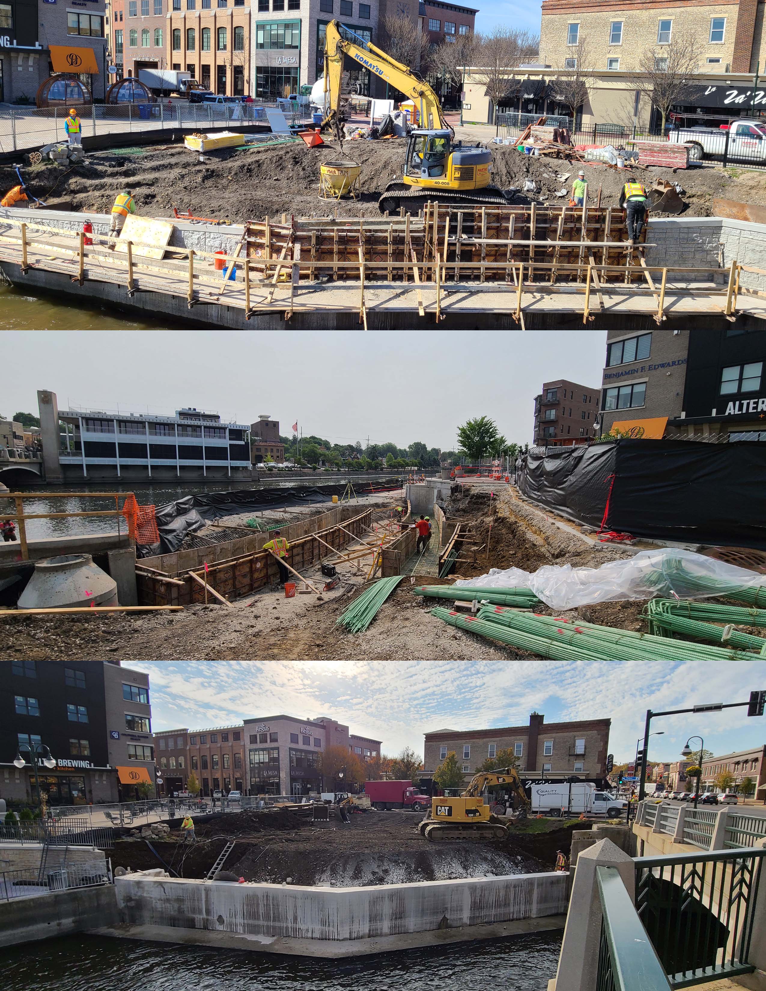 By 2020, nearly all of the parcels north of Illinois Street had been built out, except one. The northernmost parcel abutting Main Street and the Fox River was previously home to a restaurant and parking lot, which had since been demolished. All that remained was the building foundation/riverwall along with a large depression adjacent to First Street.